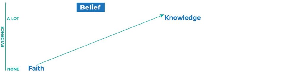 Faith, belief without evidence[2] is all you need to feel certain that a compelling story you’ve been told or an intuition you came up with is the truth. Knowledge, the best explanation we currently have based on evidence, can’t match the certainty claimed by faith but it is far more likely to be true. Faith and knowledge are both beliefs with the difference between them being evidence.