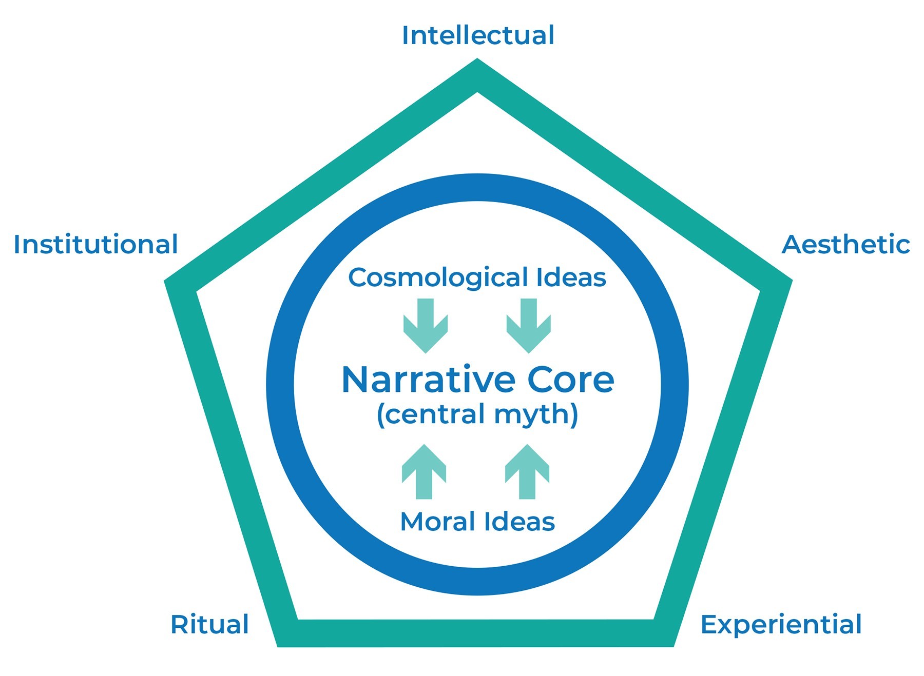 The center circle contains the beliefs the faithful adhere to and the outer pentagon shows the “strategies” employed in support of those beliefs. For example, a religious organization (institutional) holds services (ritual) held in beautiful buildings filled with art (aesthetic) in order to foster a connection to the core narrative (experiential). The intellectual strategy is employed by institutions through their support of schools, classes and scholarly interpretation of text.